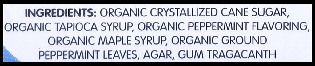Organic Crystallized Cane Sugar, Organic Tapioca Syrup, Natural Flavoring, Organic Maple Syrup, Organic Ground Peppermint Leaves, Agar, Gum Tragacanth.