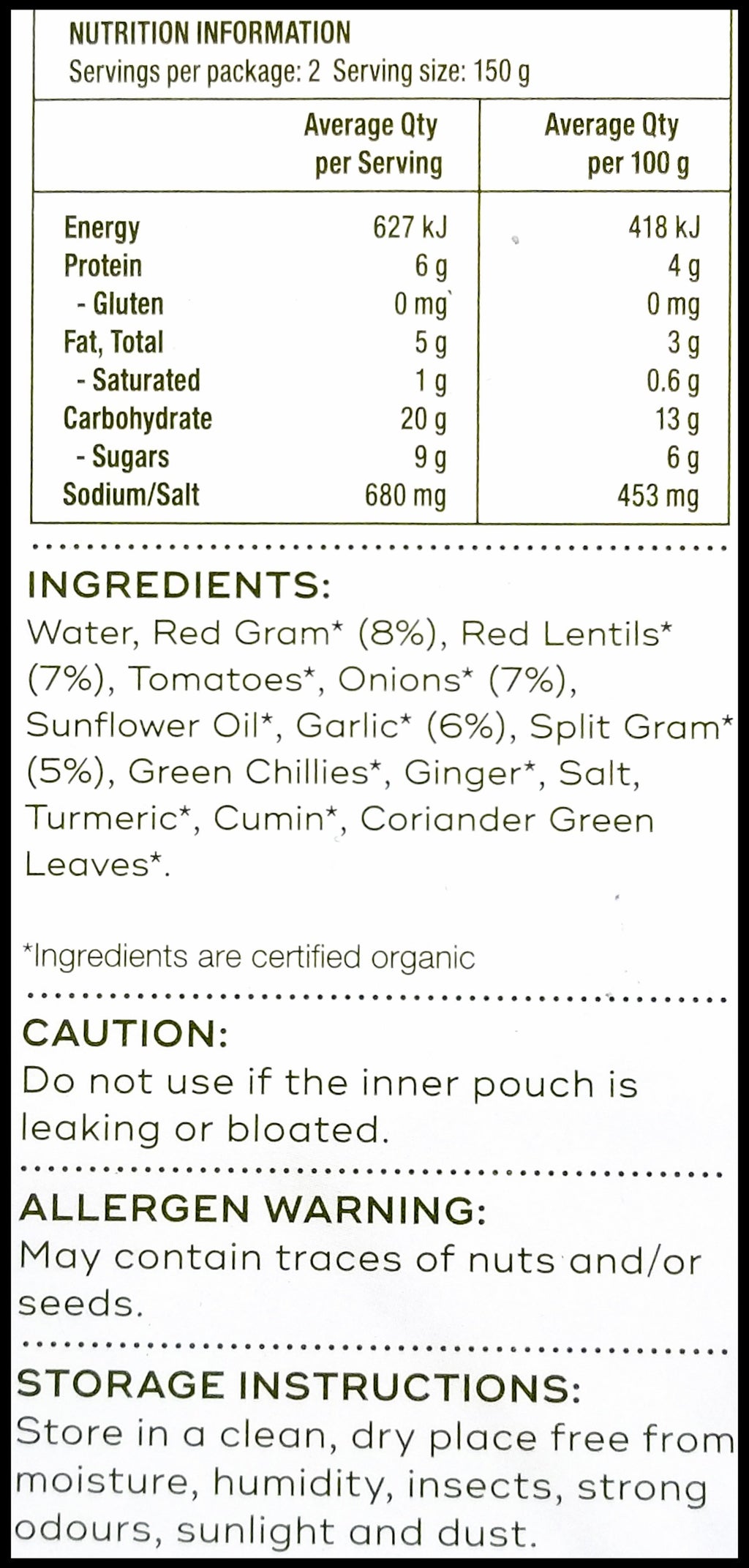 Water, red gram dal/ pigeon pea/ arhar, red lentils/ masoor dal, split bengal gram/ chana dal, onion, tomato, garlic, sunflower oil, salt, green chili, ginger, cumin, turmeric, coriander leaves.