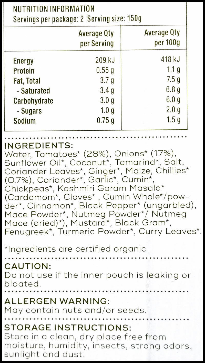 Water, Tomatoes, Onions, Sunflower Oil, Coconut, Tamarind, Salt, Coriander, Ginger, Corn Flour, Chillies, Garlic, Cumin, Chickpeas, Kashmiri Garam Masala, Mustard, Black Gram, Fenugreek, Turmeric powder, Curry Leaves.