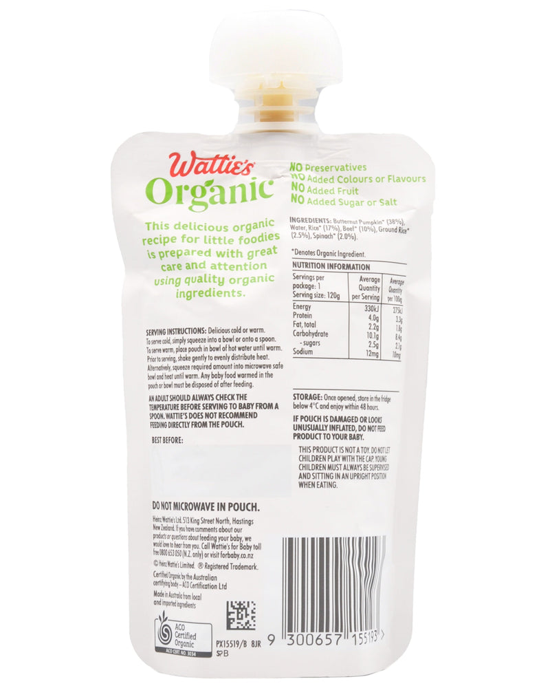 Wattie's Organic Baby Food 6+ months - Beef, Butternut Pumpkin, Rice & Spinach (120g)