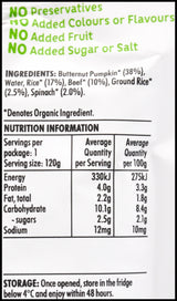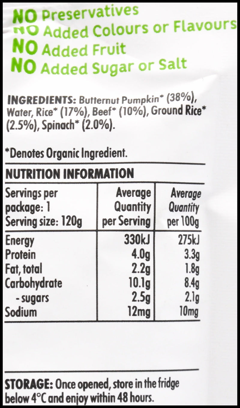 Butternut Pumpkin* (38%), Water, Rice* (17%), Beef* (10%), Ground Rice* (2.5%), Spinach* (2%). (*Certified Organic).