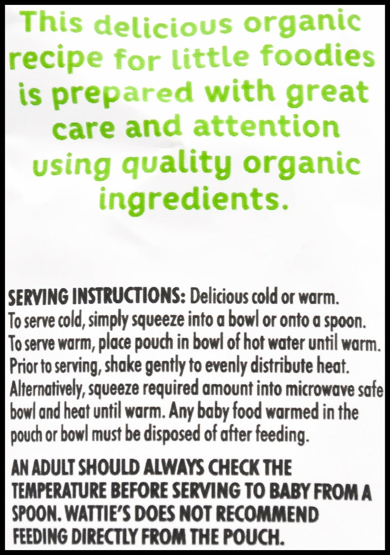 - Our Wattie's Organic baby food range is Australian Certified Organic (ACO) and is made from ingredients we trust.