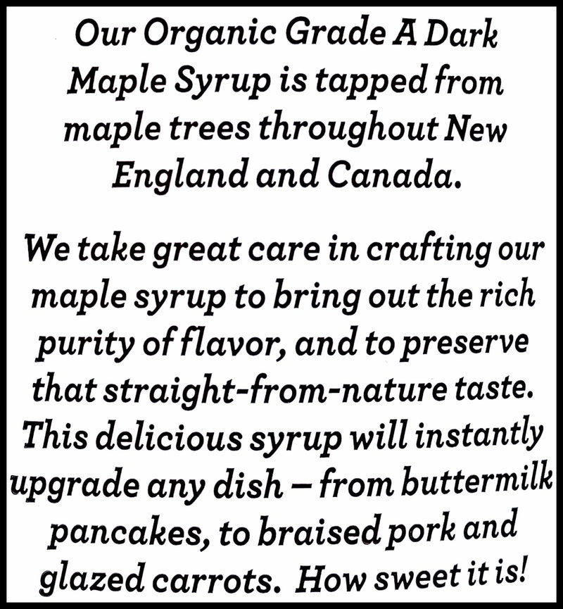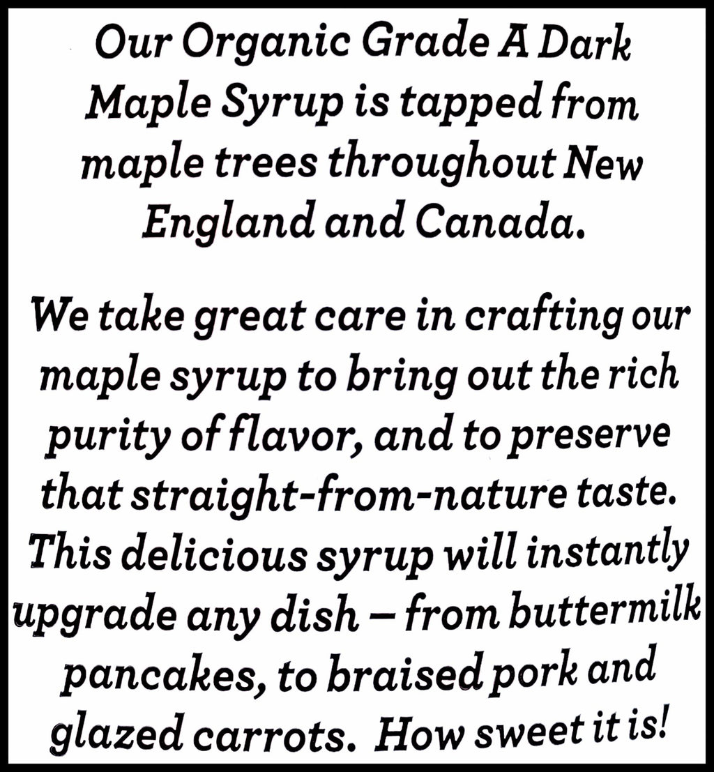 • This Organic Grade A Dark Maple Syrup is tapped from maple trees throughout New England and Canada. The maple syrup is carefully crafted to bring out the rich purity of flavor and to preserve that straight-from-nature taste.