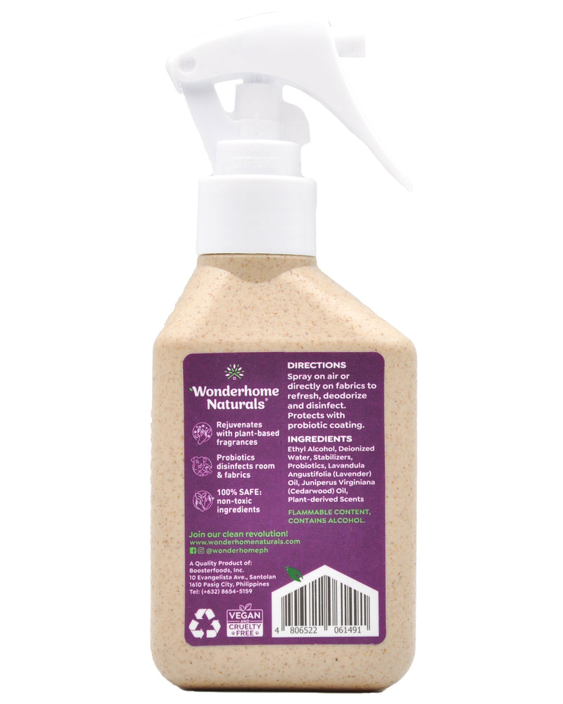 Ethyl Alcohol, Deionized Water, Stabilizers, Probiotics, Lavandula Angustifolia (Lavender) Oil, Juniperus Virginiana (Cedarwood) Oil, Plant-derived Scents.
